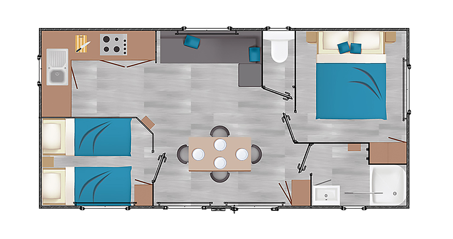 Il Bungalow Tribu è composto da due case mobili identiche, collegate da una terrazza semicoperta condivisa e attrezzata per i pasti per 8 persone.